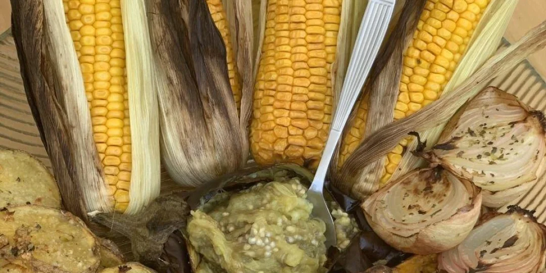 Choclo al horno con chala y verduras horneadas