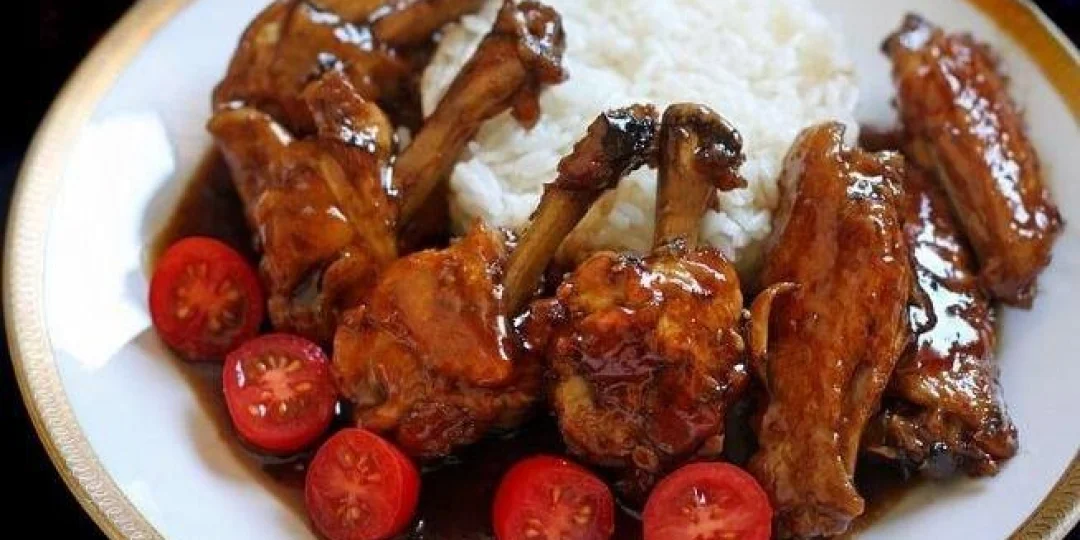 7. En un Wok o sartén profunda volcamos abundante aceite y lo calentamos a llama viva hasta que alance una temperatura elevada. Como los muslitos por ser más gruesos tardarán más en freírse, es bueno comenzar por ellos hasta lograr un buen dorado.8. Retiramos los muslitos del aceite y los posamos en papel absorbente para que drenen el exceso de aceite. Luego hacemos una segunda tanda de fritura con las piezas menos carnosas.9. Una vez doradas todas las piezas, retiramos casi todo el aceite, apenas dejando unas gotas. Bajamos a fuego medio, volvemos a introducir todas las alitas en el wok y las rociamos con azúcar.10. Ayudándonos con una pinza metálica o con un cucharón de madera, iremos moviendo las piezas para que entren en contacto con el caramelo que se va formando. Deben tener mucho cuidado de no quemar el caramelo porque tomará un sabor muy amargo que arruinará la preparación11. Una vez caramelizadas las piezas volcamos la salsa que habíamos reservado.12. Cortamos el jengibre en rodajas, picamos el diente de ajo y se los agregamos a la preparación.13. Verán como poco a poco la salsa se irá reduciendo, haciendo burbujas cada vez más espesas.14. Cuando la salsa haya alcanzado una consistencia viscosa, ya tendremos listas nuestras alitas.15. Solo nos resta emplatar. Utilizamos un aro de repostería para hacer un timbal de arroz blanco.
