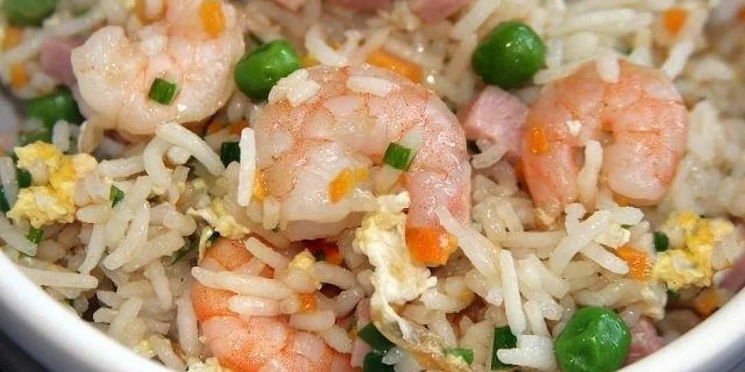 Se trata de un plato que nació para aprovechar sobras de otras comidas, por lo que su composición puede variar bastante. Uno sus ingredientes originales es el Char Siu, un embutido ahumado de cerdo, de gusto ligeramente dulzón. Nosotros lo reemplazaremos por un buen jamón cocido horneado y también le agregaremos unos camarones.
