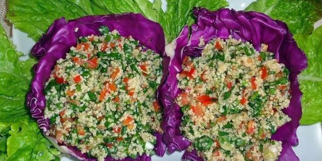 1. Colocamos en un recipiente el Cous-Cous y agregamos 150 cmts. 3 de agua salada fría. Si van a usar trigo burgol fino, deberán hidratarlo en agua hirviendo.2. Luego de 10 minutos, habrá absorbido todo el líquido, duplicando su volumen. Agregaremos un chorrito de aceite de oliva extra virgen para que los granos queden bien separados.3. Cortamos en cubitos pequeños el tomate. Piicamos fino la cebollita de verdeo y el pimiento morrón. También el perejil, que deberá estar bien seco para que no se nos haga agua cuando lo cortamos. Pueden suplantar el verdeo por cebolla común pero personalmente me parece que queda más sabroso de la forma que lo estamos haciendo.4. Los incorporamos a un bowl junto con el Cous-Cous y revolvemos bien...5. Agregamos el Arrope o Melaza de Granada que le aportará un delicioso sabor entre dulce y ácido. Este producto puede conseguirse en comercios de productos típicos árabes.6. Finalmente sumamos el aceite de oliva extra virgen y el limón a gusto y unas hojitas de menta picadas que le agregaran un toque de frescura a nuestra ensalada.7. Una buena opción para presentarla, sirviéndola en una bandeja dentro de unas hojas de repollo colorado.