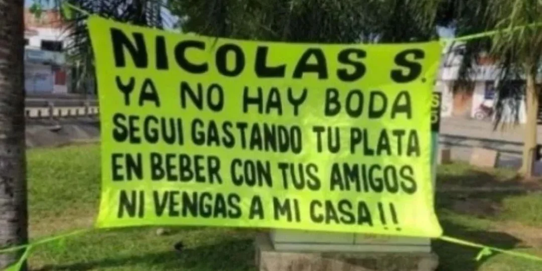 "Nicolas S. Ya no hay boda. Seguí gastando tu plata en beber con tus amigos. Ni vengas a mi casa!!", reza el letrero colgado entre dos árboles, que puso fin a la relación y conmovió a los vecinos.