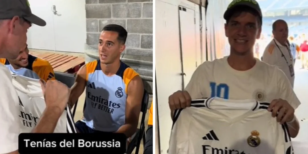 Hasta ese momento, todo iba perfecto, pero Jero Freixas nunca esperó que lo reconocieran y Lucas Vázquez lo mando al frente por su fanatismo por Messi. "¿Tú eres del Barça? Vaya que traidor", manifestó el jugador, quien le dio la mano al influencer. "La camiseta es para mi esposa", responde Freixas.