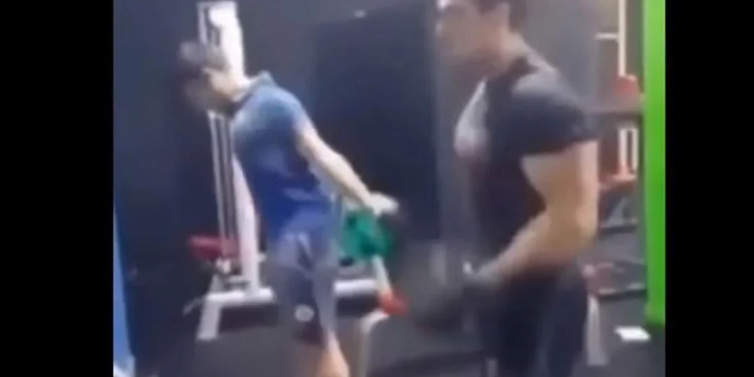 El muchacho más delgado agarra las pesas por la espalda y dobla los brazos de una manera tan extraña, que el “trabado” que estaba al lado, se asusta y se sorprende, por lo que deja de hacer sus ejercicios y analiza lo que está viendo, ya que como cualquier nosotros pensaría, es imposible que eso esté pasando pero no, es real.