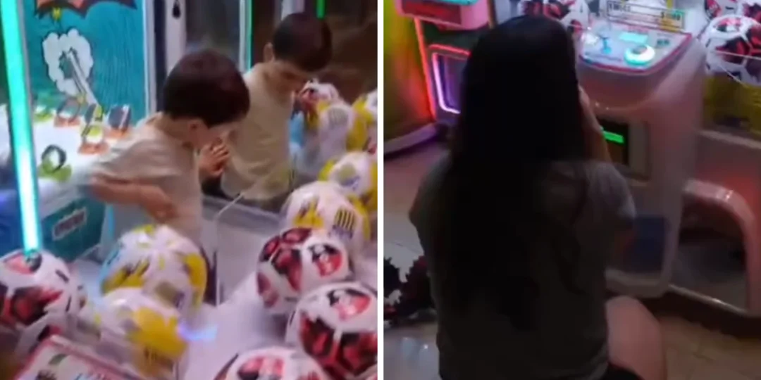 El niño aprovechó su tamaño para ingresar al interior de la máquina y justo cuando iba a sacar una pelota de fútbol, su mamá llegó. La escena, que podría haber terminado en un pequeño desastre, se transformó en un momento gracioso y entrañable.
