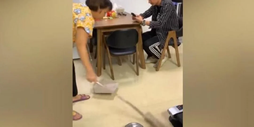 No se contuvo y fue a recriminarle con escoba en mano a su hijo por hacerle perder el tiempo. El joven salió corriendo del lugar.