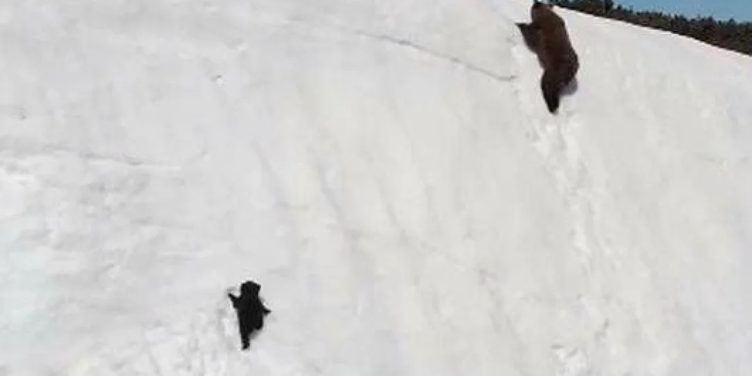 Después de varios intentos, el oso menor lo logra y agarra la velocidad suficiente para subir junto a su mamá.