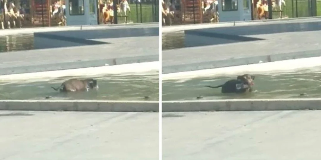 El perro entra a una fuente en una plaza, y sumerge su cabeza en el agua; después de algunos segundos, sale a flote con una botella plástica, que aparta para desecharla.