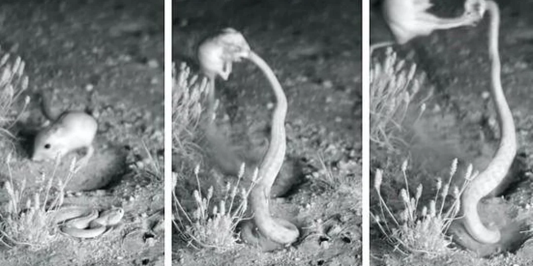 En una de las grabaciones de puede ver como la serpiente cascabel intenta atacar al roedor, el cual da en el aire un giro de 90 grados y patea la cabeza del reptil.