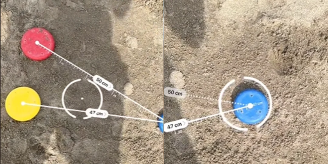 Colocaron los tejos amarillo y rojo a prueba, midiendo la distancia de ambos con respecto al azul. Según los datos de la app, el tejo amarillo estaba más cerca.