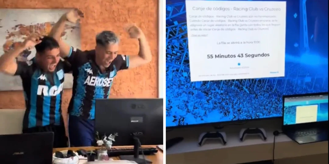 El video muestra a dos jóvenes con una llamativa estrategia: prender todas las pantallas posibles y hacer la fila en línea para conseguir una entrada. Más de tres celulares, dos computadoras y dos televisores para alentar a Racing Club en Paraguay.