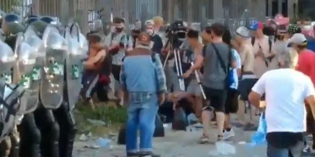 Así, decenas de personas sin barbijo se amontonaron disputándose una pelota que rodaba de un lado a otro entre patadas y empujones. Mientras tanto, algunos decidían desistir del "partido" y trepaban las rejas intentando alcanzar la entrada a Casa Rosada. El amontonamiento y la provocación de algunos jugadores provocó la reacción de los policías que custodiaban el ingreso al lugar, quienes respondieron con gases lacrimógenos y camiones hidrantes.
