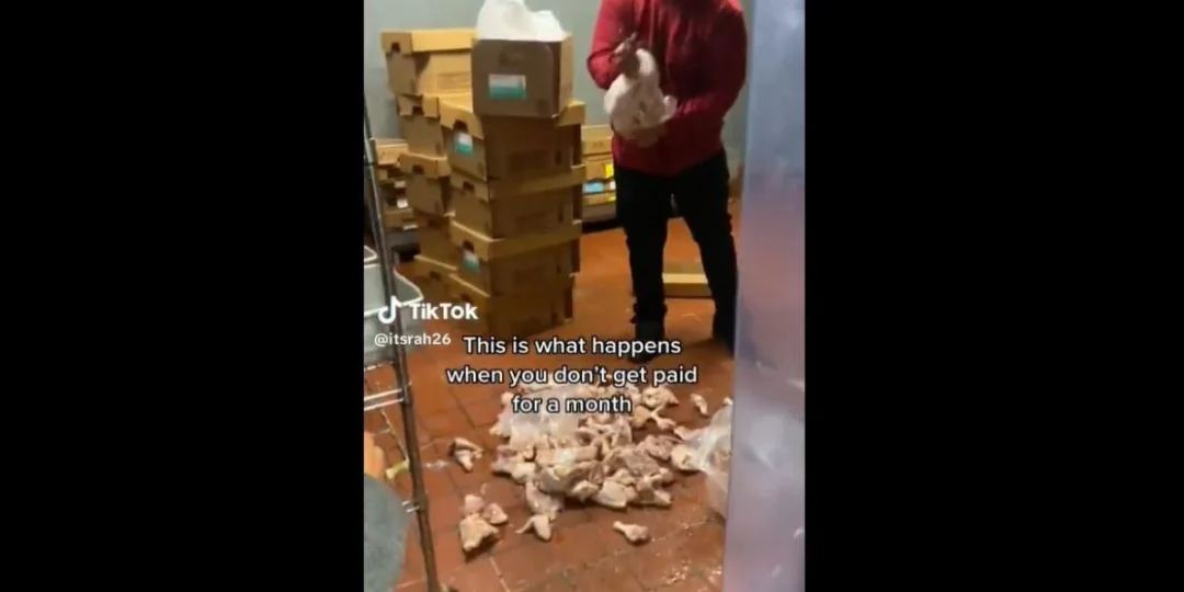 En las imágenes se puede ver al trabajador arrojando piezas crudas de pollo al suelo y rompiendo cajas de papas fritas.
